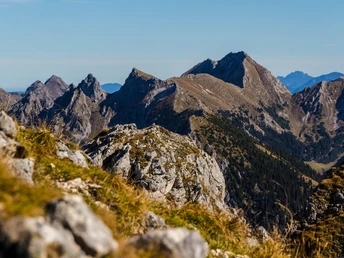Der Absteig erfolgt Richtung Osten. Hier führt Sie der Weg auf einem gut gesicherten Grat entlang ehe der Weg wieder breiter wird und Sie weiter absteigen. Der Weg wird flacher und Sie erreichen das Weitalpjoch. Von hier aus halten Sie sich rechts in Richtung Roggental bis Sie den Abzweig, welchen Sie vom Aufstieg her kennen, erreichen. Die letzten 400 Hm geht es auf diesem schönen Weg zurück zur Ammerwaldalm.