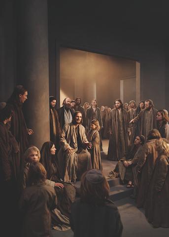 Zu Beginn jedes Abschnitts tritt ein Chor auf und führt ein „lebendes Bild“ vor, indem Darsteller Szenen aus der Bibel nachstellen. Diese Szenen sind kontemplative Interpretationen, die mit Musik und Gesang vom Orchester und Chor unterstützt werden und Verbindungen zum Alten Testament herstellen.
