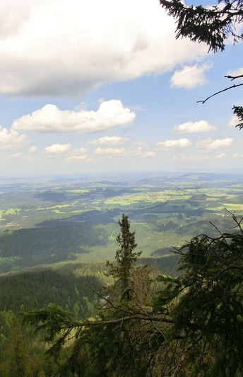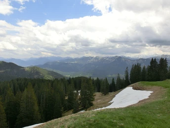 Sie bleiben weiter gerade aus auf dem markierten Forstweg (die Abzweigung führt links in eine Sackgasse) und passieren bald die Saulochhütte. Bei der nächsten Abzweigung wandern Sie nach links zur Lähnbachhütte und erreichen über einen schmalen, teils steilen Steig bald die Niederbleick. Da dies der aussichtsreichste Punkt der Tour ist, lohnt es sich hier eine Pause zu machen und den Weitblick ins Voralpenland zu genießen. Gut erkennbar ist vor allem die imposante Wieskirche auf einer großen Lichtung. Vorbei an der Bleickhütte führt der Weg noch kurz zum Gipfel der Hohen Bleick (10 Min.). Dieser ist allerdings bewaldet und bietet nicht so viel Ausblick.