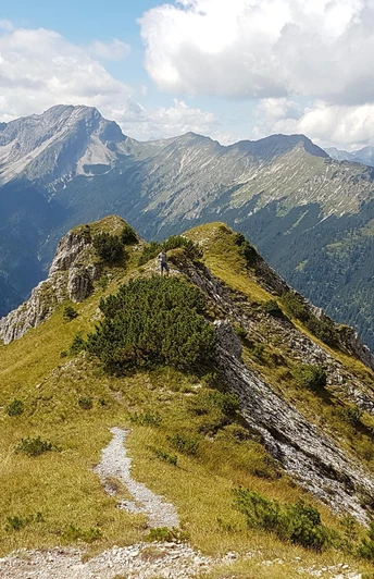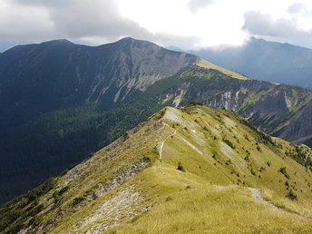 Über "In den Gruben" und steile Schrofenhänge erreichen Sie zuerst den Geißensprüngkopf und danach übern einen Steig den Kienjoch mit seinem Gipfelkreuz.