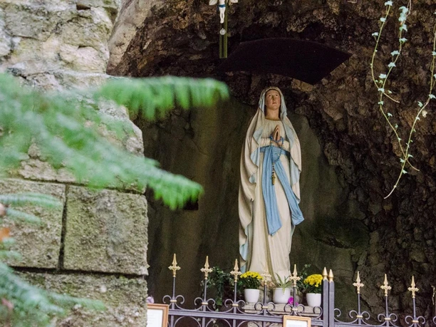 Zum Weitergehen wenden wir uns dem Fußweg durch die kleine Birkenallee zu, folgen ihm bergauf und gehen ein Stück am Höhenrücken entlang bis wir in eine alte Eichenallee gelangen. Am Ende biegen wir rechts in eine kleine Birkenallee ab. Wo sie endet, folgen wir dem Wegweiser „Lourdesgrotte“ zuerst nach rechts und kurz darauf in den Fußweg nach links. Die 1893 erbaute Grotte wurde 1999 in die Denkmalschutzliste aufgenommen. Es erwarten uns eine Stele und Bänke zum Verweilen.