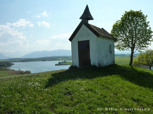 Wir gehen geradeaus an den Seestuben vorbei, kommen kurz darauf an eine Gabelung und biegen links in den Fußweg ein. Schon nach kurzer Zeit wird der Weg schmäler und führt zwischen Weideland und Wald ganz in der Nähe des Riegseeufers entlang. Schon bald treten wir wieder in die freie Landschaft hinaus und folgen immer weiter diesem Wanderpfad am Ufer entlang. Wir passieren mehrere private Grundstücke, bevor wir einen kleinen öffentlichen Badeplatz erreichen. Hier endet der Pfad, wir biegen nun rechts auf einen Feldweg ab. Wo er auf das nächste Sträßchen trifft, gehen wir links und dann geradeaus weiter bis wir auf eine Teerstraße treffen. Schon von weitem sehen wir die Mesnerhauskapelle auf dem Hügel.