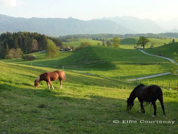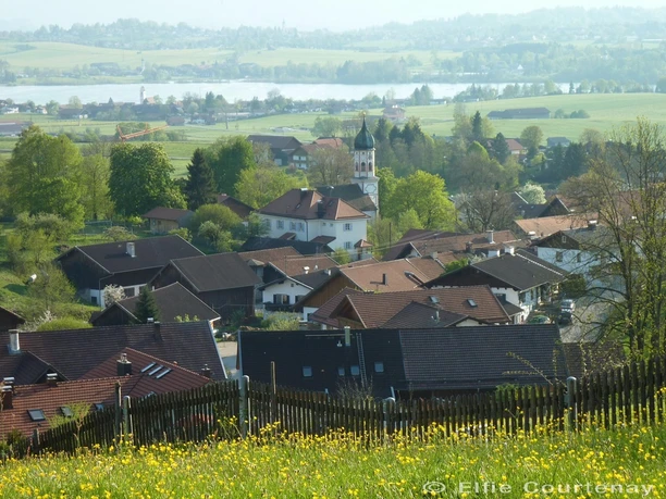 Bei Neuschnee im Winter kann es sein, dass der Fußweg am See nicht gespurt ist. Dann biegen wir nicht in die Seestraße ab, sondern gehen rechts weiter, passieren den Gasthof Westner (Ruhetag dienstags von Mai bis September, Montag und Dienstag von Oktober bis April), Tel. 0 88 41 / 9 06 73, www.westnerriegsee.de und gleich darauf das „Haus des Gastes“. Kurz danach biegen wir links in die Hofheimer Straße ab und folgen diesem Sträßchen so lange, bis wir auf eine Teerstraße treffen. Schon von weitem sehen wir die Mesnerhauskapelle vor uns auf dem Hügel.