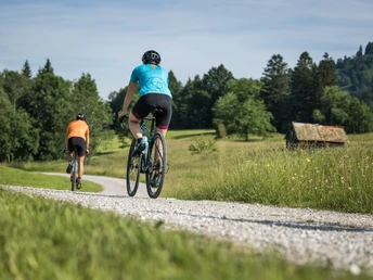 Sie halten sich links und fahren entlang der Halbammer. Nach ca. 3 km (an einer Weggabelung) radeln Sie rechts über die Brücke, nach weiteren 200 m wieder rechts und auf der immer steiler werdenden Forststraße bergauf. An der nächsten Wegkreuzung fahren Sie die Forststraße rechts abwärts, den Osthang des „Hochwildfeuerbergs“ querend.