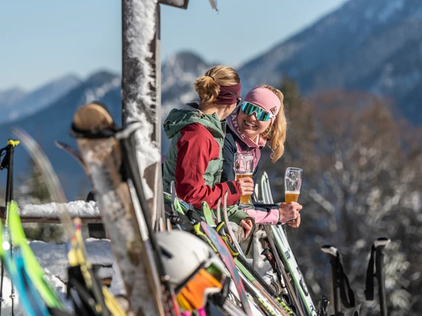 Vor der Abfahrt unbedingt auf der Kolbensattelhütte vorbeischauen. Hier können Sie in der Umkleide Ihre Kleidung wechseln und sich mit warmen Getränken und bayerischen Schmankerln für die bevorstehende Abfahrt stärken.