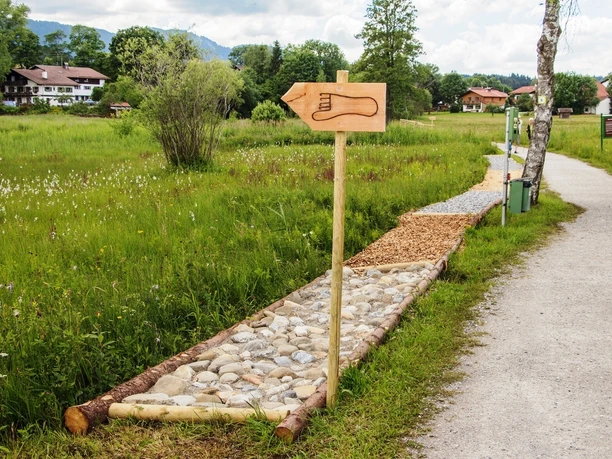 Entlang des Sees verläuft auch ein Barfußpacours, bei dem Alt und Jung die unterschiedlichsten Untergründe mit den Füßen erkunden können.