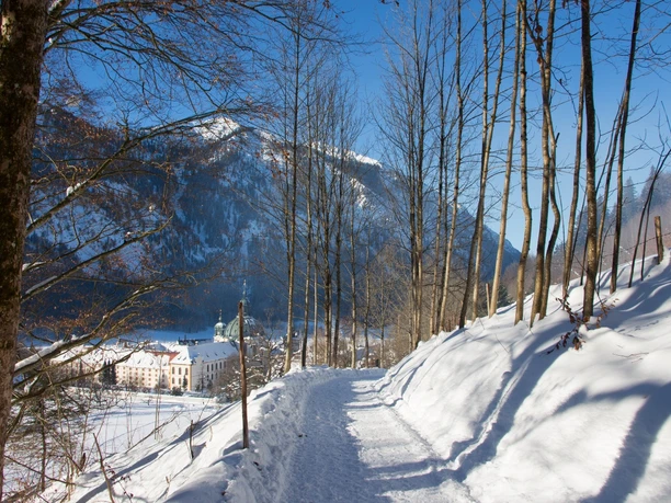 Diese kurze Runde startet am Kloster Ettal und folgt zunächst der Straße in Richtung Oberau. Kurz vor Ortsende – bei der Bushaltestelle – biegen Sie in die Alte Bergstraße ein. Nach ca. 150m geht es links ab und Sie wandern bergauf bis zum Beginn des Enzianweges. Von dort geht es über kupiertes Gelände durch den Wald, mit teils wunderschönen Blicken ins Graswangtal. Am Ende des Enzianweges treffen Sie auf den Wanderweg, der zum Ettaler Manndl führt. Hier folgen Sie aber dem Weg nach links in Richtung Tal. Gleich darauf nehmen Sie den rechten Weg (Höhenweg) und laufen auf diesem Weg um die gesamte Klosteranlage herum zurück ins Dorf zum Startpunkt.